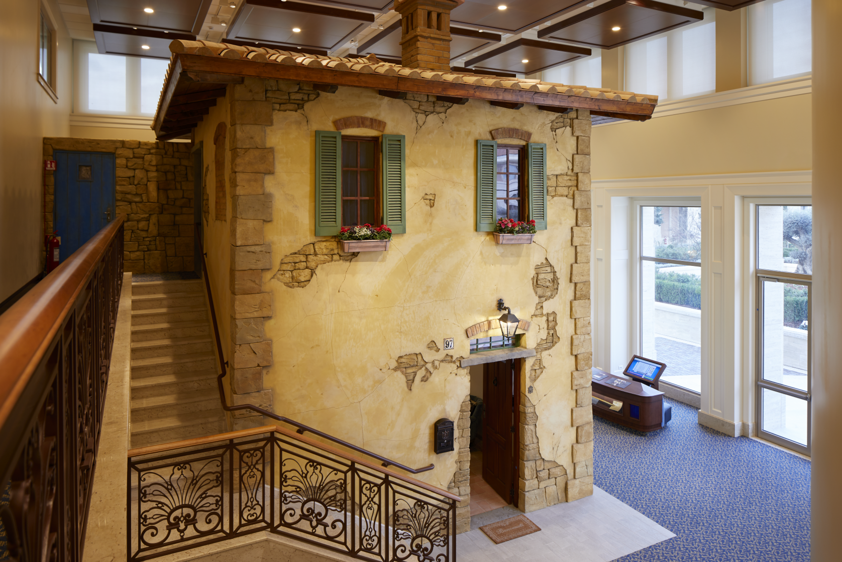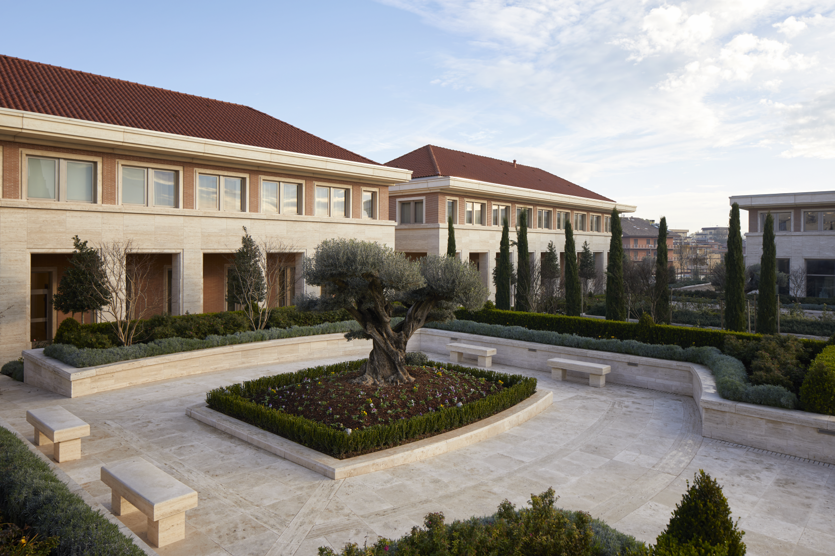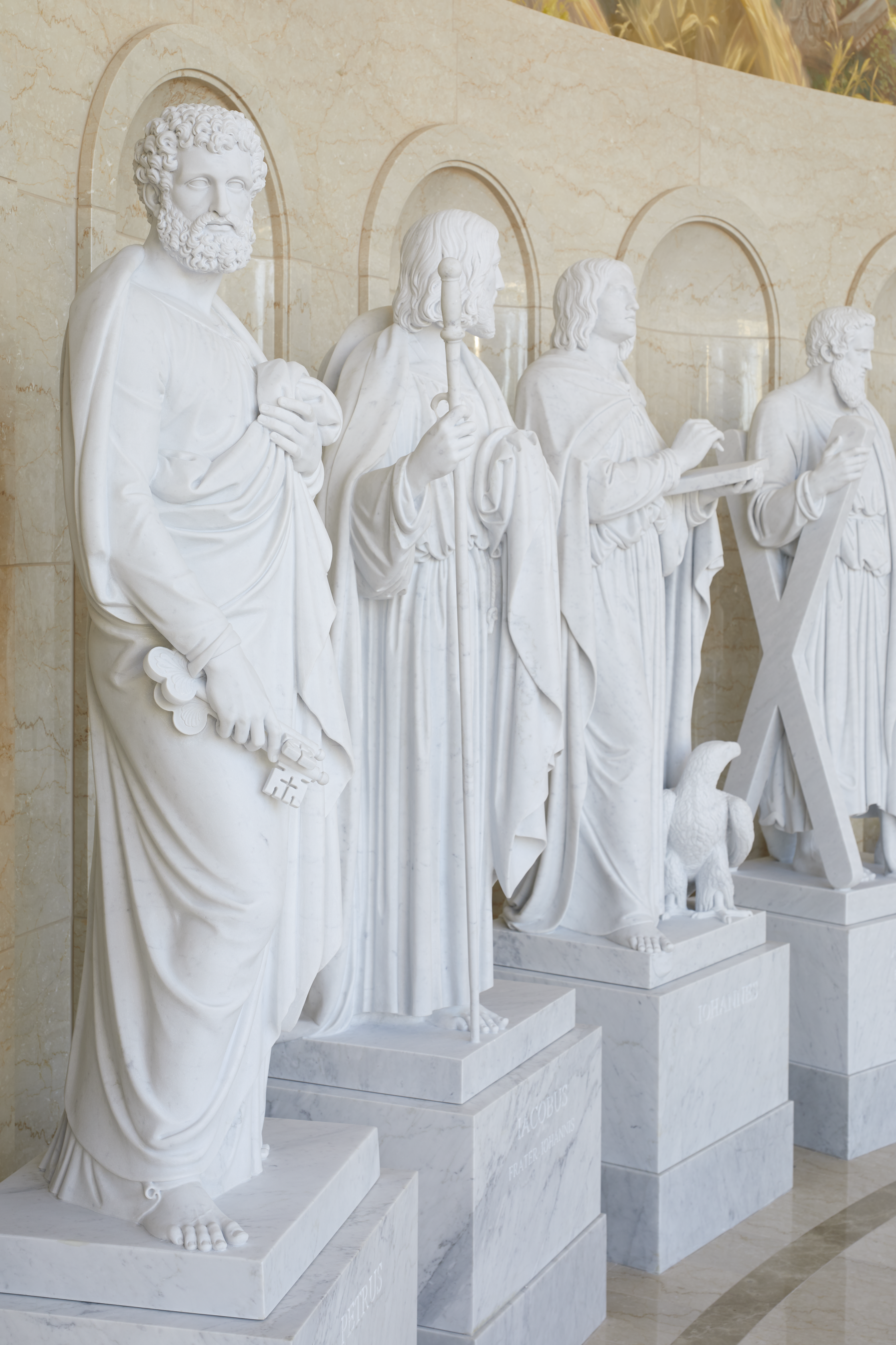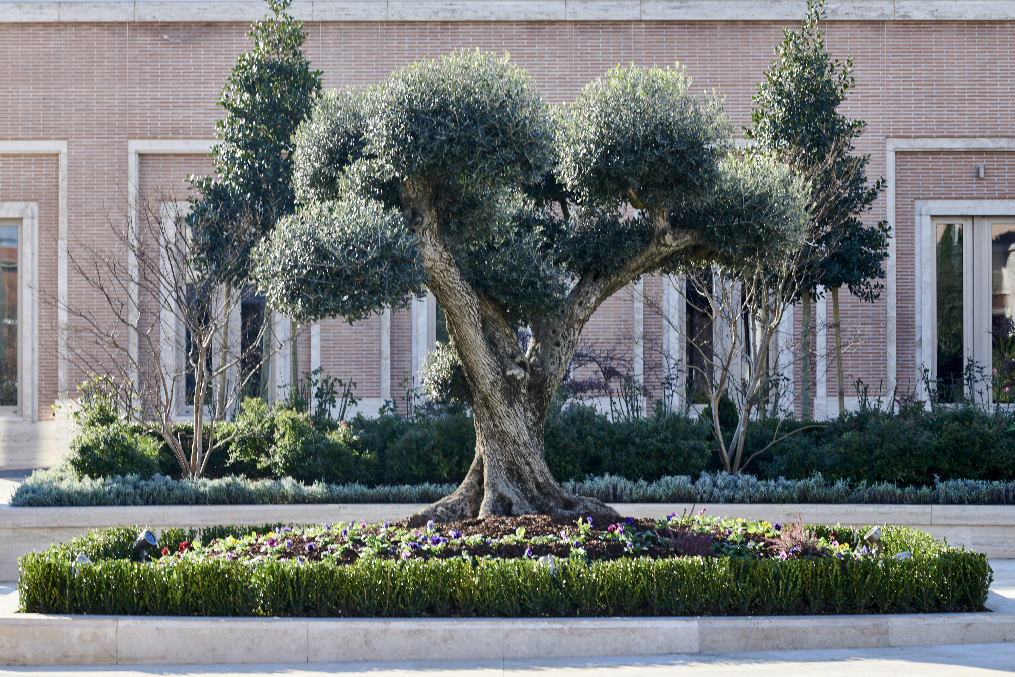 Gli olivi, che rimandano senz’altro alle letture del Vangelo, ritornano anche quali elementi decorativi del tempio. “Prima di iniziare la costruzione del tempio erano presenti nell’area cinquanta olivi centenari che sono stati, poi, trapiantati nel giardino. Tutti i componenti decorativi, dalle vetrate alle porte, riportano la foglia d’olivo. Un simbolismo ricorrente ed importante che ci ricollega subito al giardino di Getsemani di Gesù Cristo. Abbiamo avuto la possibilità di collaborare con grandi professionisti da tutto il mondo: dai lavoratori del legno, della pietra ai grandi artisti che si sono occupati delle rifiniture” commenta Maria Camilla Rubei, responsabile dei lavori insieme a Dionisio Graziosi.